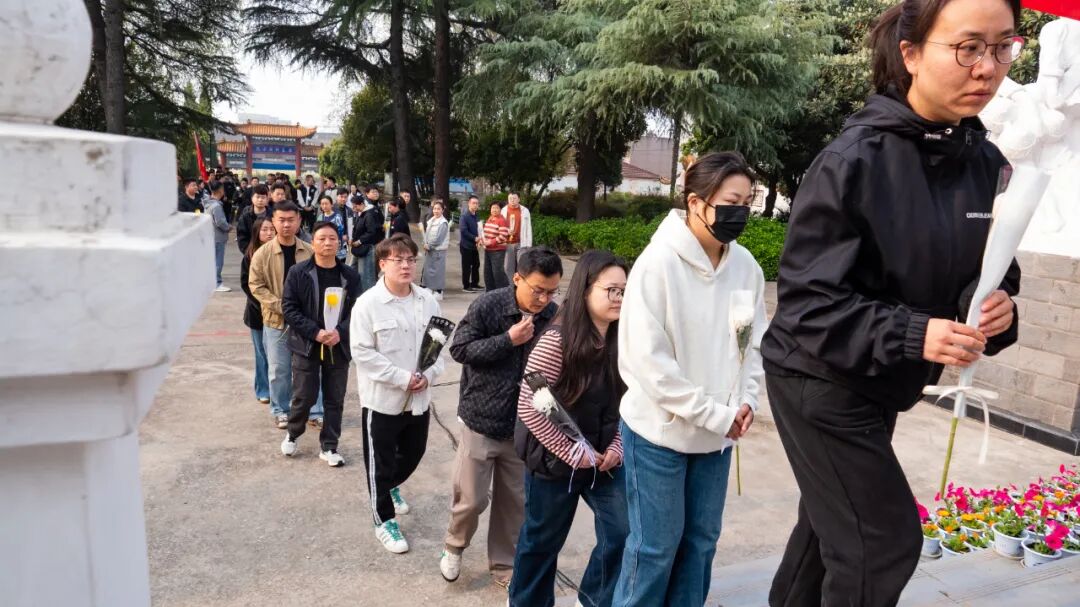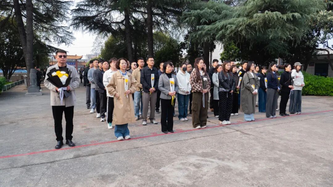 松柏苍翠、庄严肃穆。职工们整洁着装,手持洁白菊花,神情肃穆地列队前行,每一步都承载着对先烈的敬重与追思。在巍峨的革命烈士纪念碑前,全体人员肃立默哀,低头静思,在三分钟的静默里,回望那段烽火峥嵘的岁月,感念先烈们舍生取义、护佑家乡的无畏壮举,空气中满是沉静的哀思。